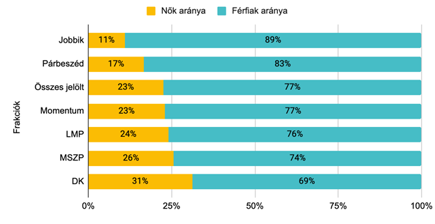 A 253 jelölt között 57 nő és 196 férfi található, tehát a jelöltek soraiban a nők aránya 22,5, a férfiaké pedig 77,5 százalék (lásd 1. grafikon). Világos, hogy ez az arány messze elmarad a nők valamivel 50 százalék feletti arányától a társadalomban. A Jobbik indítja a legkevesebb női jelöltet (11 százalék) és a DK a legtöbbet (31 százalék). A kettő között helyezkedik el a női arányt tekintve a Párbeszéd (17 százalék), Momentum (23 százalék), LMP (24 százalék) és az MSZP (26 százalék).