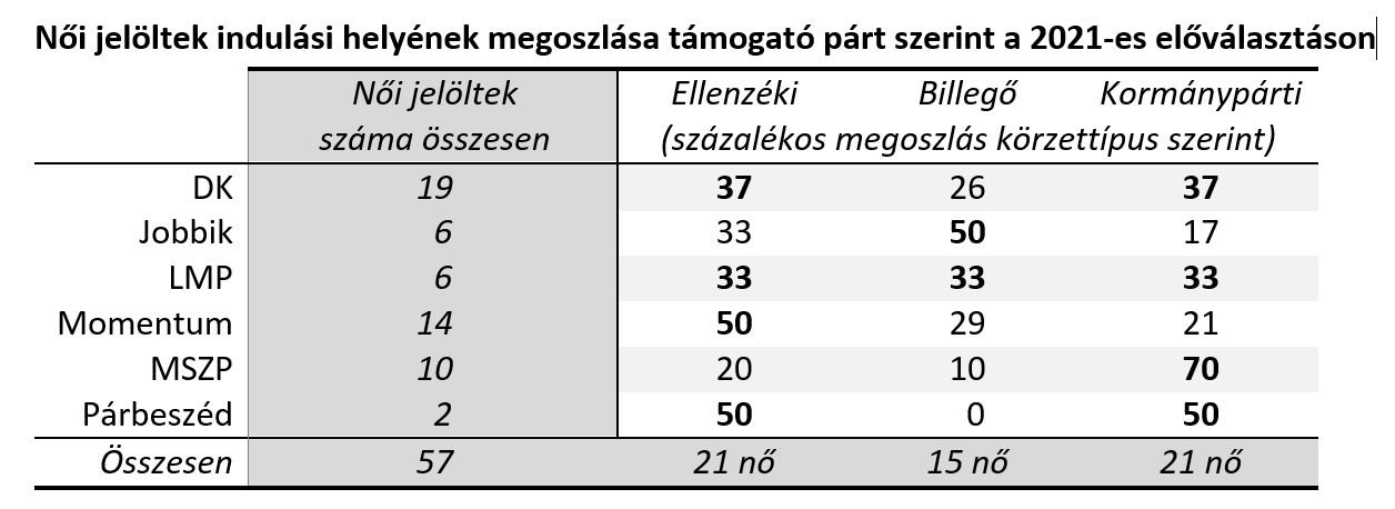 Önmagában a női jelöltek adott aránya nem dönti el a női képviselők arányát a parlamentben. Korántsem mindegy, hogy a női jelöltek hol indulnak, hiszen a körzet jellege erősen befolyásolhatja a jelölt sikerét. A korábbi választások alapján viszonylag nagy biztonsággal meghatározható, hogy egy adott körzetben a jelöltet indító pártszövetségnek milyen esélyei vannak a győzelemre. A körzetek jellegének meghatározásához a 21 Kutatóközpont elemzését használtam, amely három csoportba sorolja az egyéni választókerületeket aszerint, hogy azok ellenzékinek, billegőnek vagy kormánypártinak számítanak-e. (A csoportosításhoz a 2019-es európai parlamenti választási eredmény országgyűlési választókerületi bontását vették alapul és azt minimálisan kiegészítették az önkormányzati választás eredményeivel. Az elemzés elkészülte után még a bajai kerületet átcsoportosítottak kormánypártiból billegőre.) Mivel csak 106 OEVK van, ezért nagyon alacsony a jelöltek száma, különösen a női jelölteké, ezért a kis különbségeken nem szabad leragadni. Az alábbi táblázat százalékos arányokkal mutatja meg, hogy az egyes ellenzéki pártok női jelöltjei milyen körzettípusokban indulnak az előválasztáson.