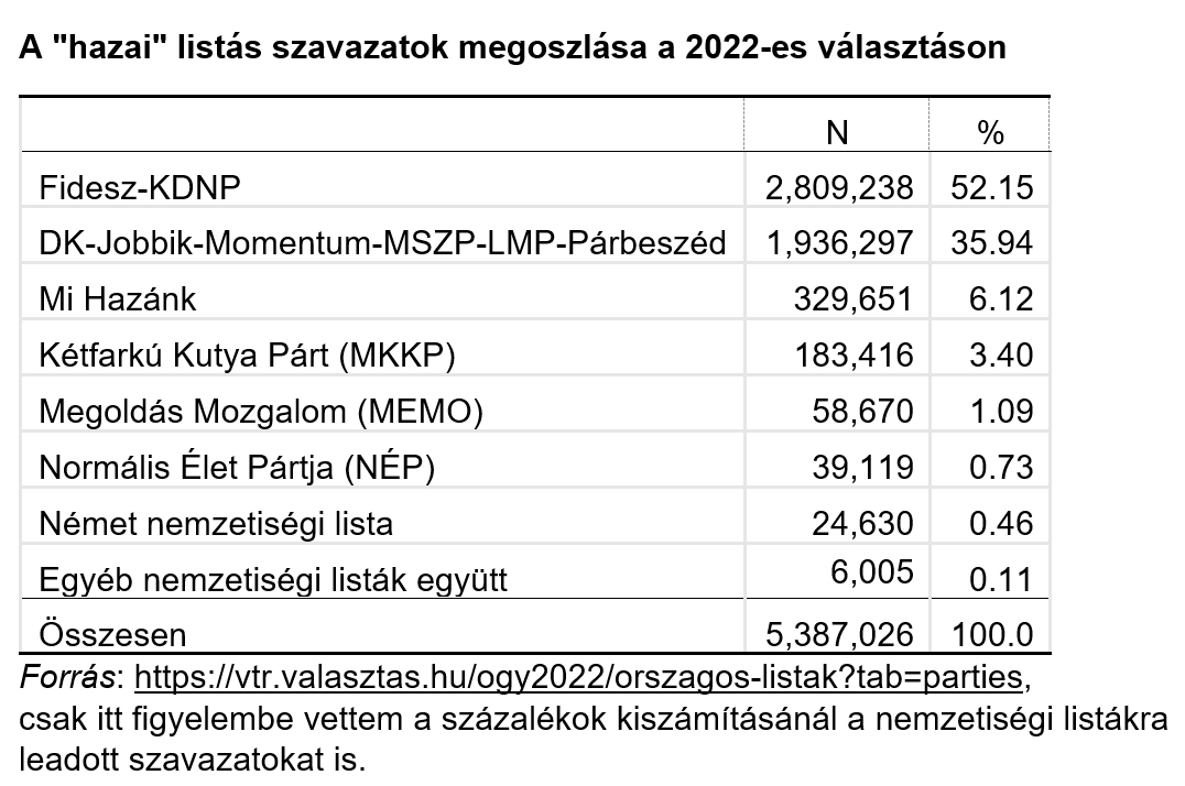 A pontos számítás szerint a levélszavazatok nélkül számított „hazai” eredmények alapján a Fidesz-KDNP 52,15%, az ellenzéki közös lista pedig 35,94% listás szavazatot kapott. Két-három tizeddel kevesebb, mint ahogy az NVI mondja, üsse kő.
