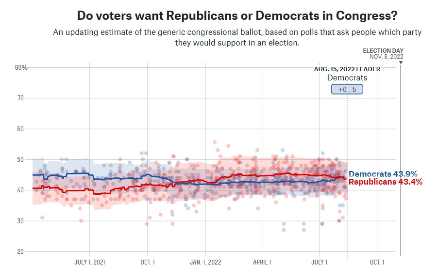 Donald Trump pártja novemberi sikerének most viszont az került az útjába, hogy a demokraták augusztus ötödikén visszavették a vezetést a közvélemény-kutatások átlagában a februártól hat hónapon át 2-2,5 százalékkal vezető, de a júniusi abortusz-ügyi Legfelsőbb Bírósági ítélet után (átmenetileg?) lejtmenetre került republikánusoktól.