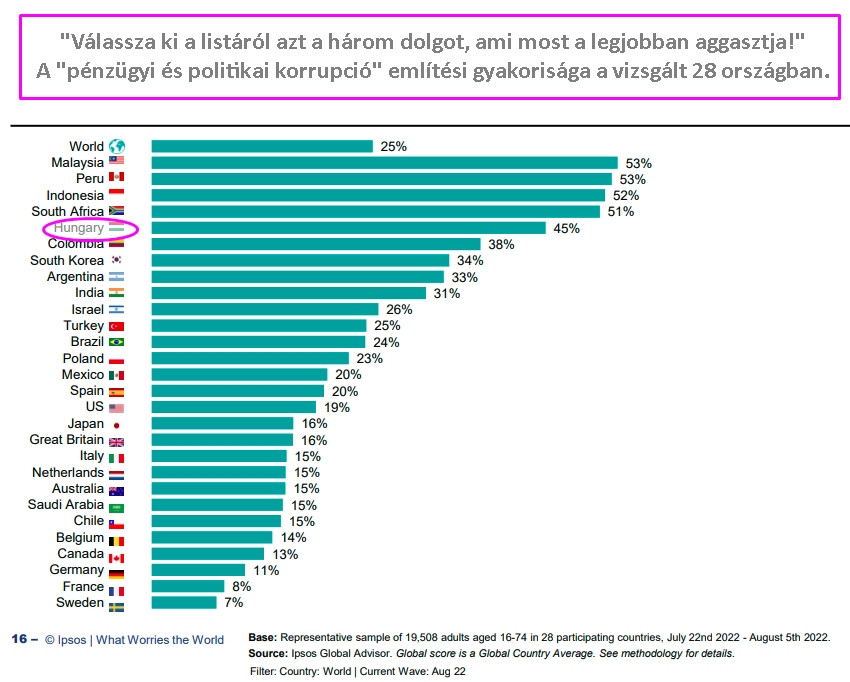 A pénzügyi és politikai korrupciótól való rettegésben viszont megint a világbajnokok között vagyunk: csak Dél-Afrikában, Indonéziában, Peruban és Malajziában sikerült egy picit felülmúlni a mi 45 százalékos korrupció-említési arányunkat (a 28 országon alapuló "világátlag" 25%). Azért Indiát felülmúlni ebben, főleg hogy ott a korrupcióra kényesebb középosztály felé lejt egy ilyen online minta, igazán komoly eredmény.