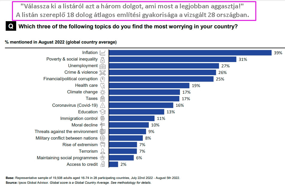 Rendszeresen megkérdezik azt is, hogy egy hosszabb listából mi az a három dolog, amitől legjobban aggódnak a megkérdezettek. Most augusztusban világszerte és Magyarországon is az infláció és „a szegénység, a társadalmi egyenlőtlenségek” vezeti a félelemlistát. Hazánkban viszont a globális átlagnál sokkal többen (52 és 47%) választották ezt a két lehetőséget a listáról. A 28 ország átlagában harmadik és negyedik helyezett munkanélküliség és „bűnözés, erőszak” ezzel szemben rendhagyóan keveseket aggasztott Magyarországon, mint ahogy a koronavírus és a klímaváltozás is a globális átlagnál kevésbé izgatja a magyarokat.