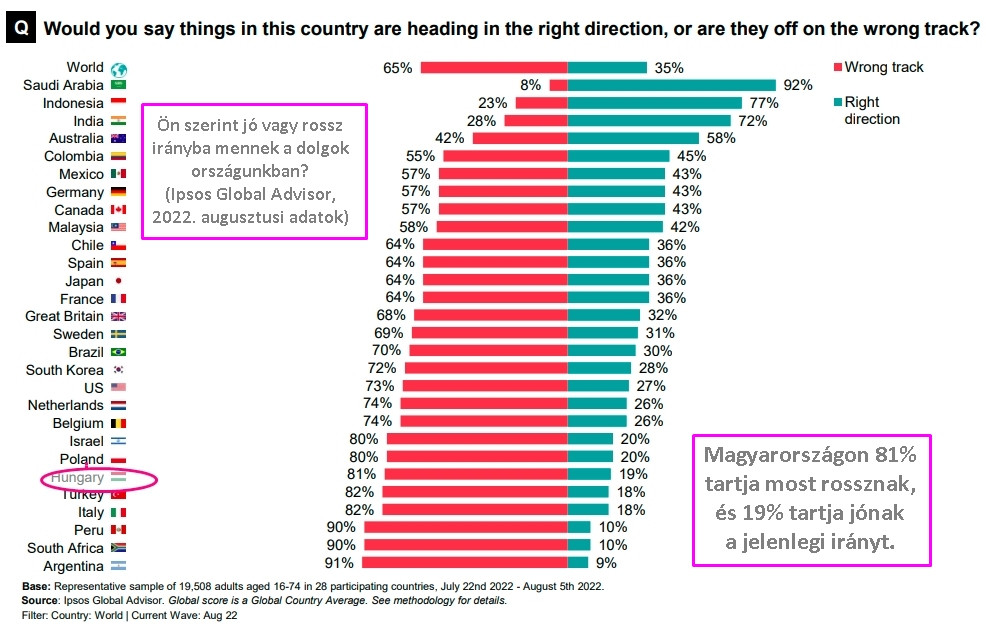 Megjelentek az Ipsos havonta elvégzett világkörüli hangulat-felmérésének augusztusi adatai. Lényegében mindenütt a gazdasági borúlátás növekedését tapasztalták az elmúlt hónapokban, Magyarországon azonban különösen sokat romlott a közhangulat. Azok aránya, akik szerint jó irányba haladnak a dolgok az országban 19%, ami most az egyik legalacsonyabb a világon. Európában csak Lengyelországban, Olaszországban és Törökországban találtak ilyen rossz közérzetet most.