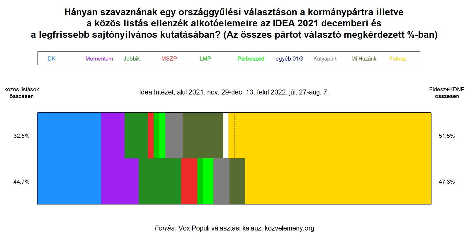 Pontosan ugyanezt mutatja egyébként az IDEA decemberi és augusztusi adatainak összehasonlítása is (ld. alább), leszámítva azt, hogy náluk a DK őrizte meg támogatottságát, és az ő kérdőíveikben nem választhatták a megkérdezettek a közös listát meg az MMM-et az írásos kérdés által megadott válaszalternatívák közül (a Publicus telefonon kérdez, pártlista nélkül, így ott spontán bemondhatnak olyan opciókat az embereket, amit az IDEA-nál nem. Augusztusban pl. egy százalék már Jakab Péter pártját emlegette, őket az "egyéb pártokat" jelző fehér rész tartalmazza az ábrákon).