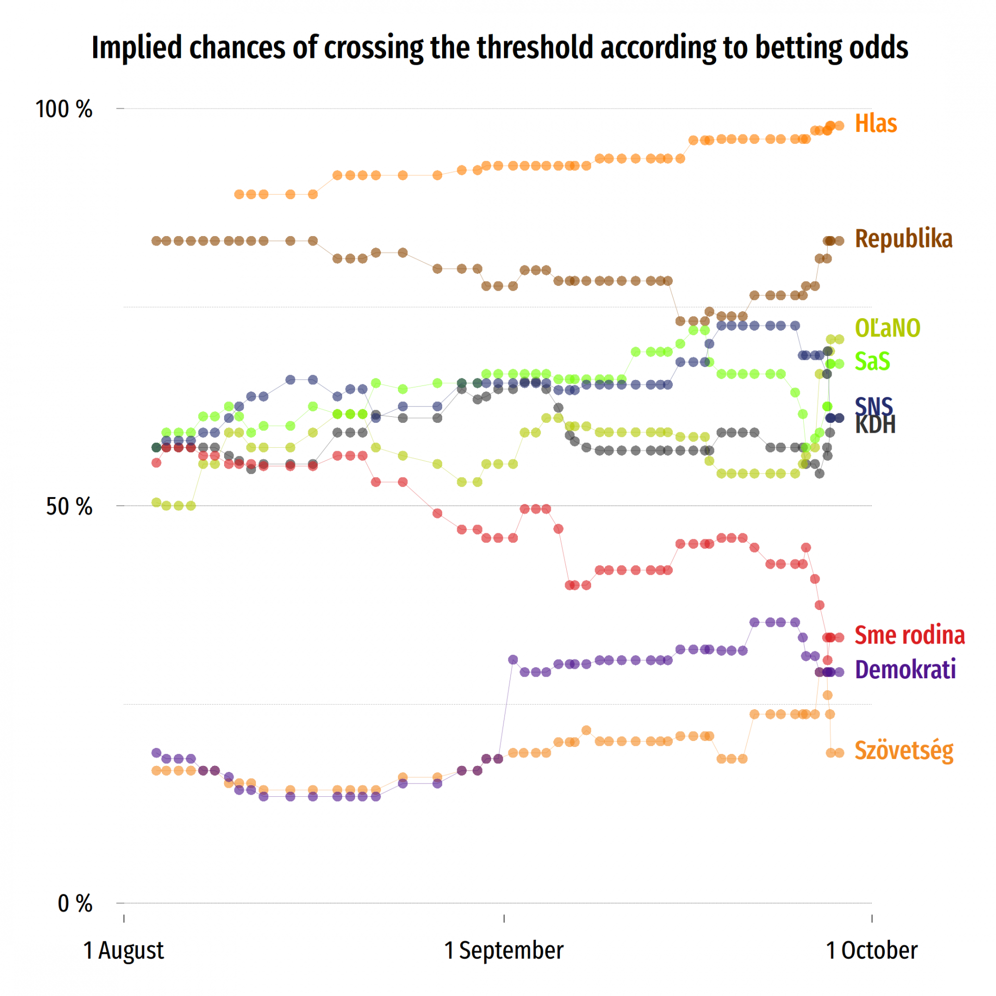 A magabiztos előrejelzések változatossága drámában gazdag választási éjszakát ígér, amely meglepő koalíciós tárgyalásokat indíthat el. Legutóbb a közvélemény-kutatók és a bukmékerek nemigen tudtak lépést tartani a végső győztes, a populista-jobboldali OĽaNO választási eszköz meredek emelkedésével (a választások előtti két hétben tilos volt választási közvélemény-kutatásokat megjelentetni, és az addig megjelent adatok max. 15%-ra taksálták a végül a szavazatok negyedét megszerző pártot). Ezúttal nincs jele ilyen gyors változásnak, ha csak azt nem számítjuk ide, hogy az utolsó hat előrejelzés közül kettő az eddig a második helyre várt Progresszív Szlovákiának (PS) adott a hajszálnál is vékonyabb előnyt, miután a harmadik helyre várt Hang (inentől Hlas) az utolsó pillanatban mintha elhódított volna pár szavazót a Robert Fico vezette Iránytól (a továbbiakban Smer). A legtöbb trend hónapok óta egyenletes, miként a 2020-22-ben csak második-harmadik Smer vezetése is az összes kutatások átlagában.