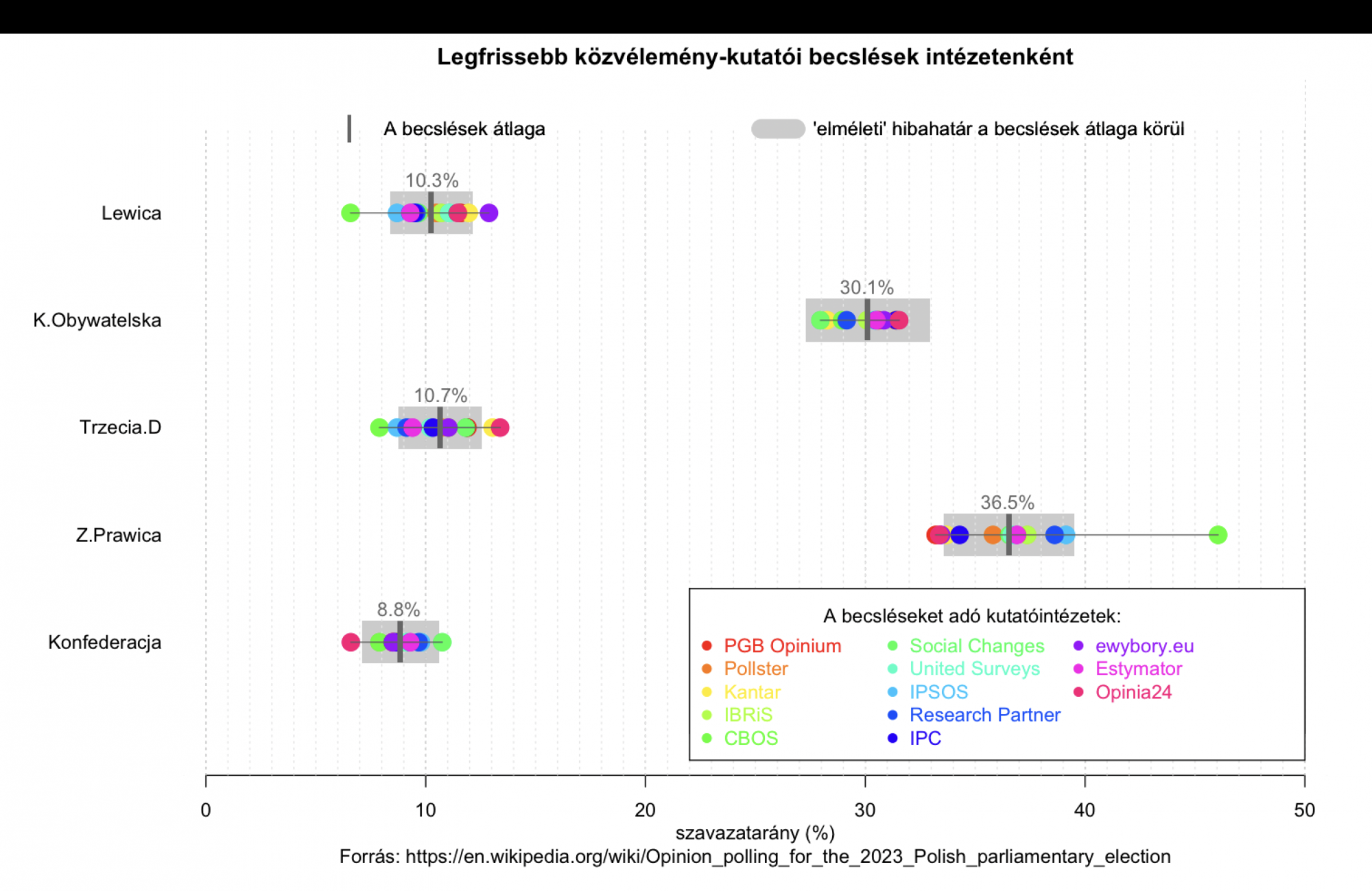 Talán észre se vették, de a lengyelek meglehetősen pontos választás előtti közvélemény-kutatásokhoz szokhattak hozzá az utóbbi években. Ezek még az igencsak akkurátus exit pollnál is pontosabban jelezték előre a tényleges szavazatarányokat 2015-ben. Már ha valaki kiszámolta a különböző kutatások átlagát úgy, mint a mellékelt ábrán mutatom, tehát minden intézetnek csak a legutolsó becslését nézte, és kigyomlálta az egy hónapnál régebbi adatokat meg a “nem tudom” válaszokat a százalékolás bázisából.
