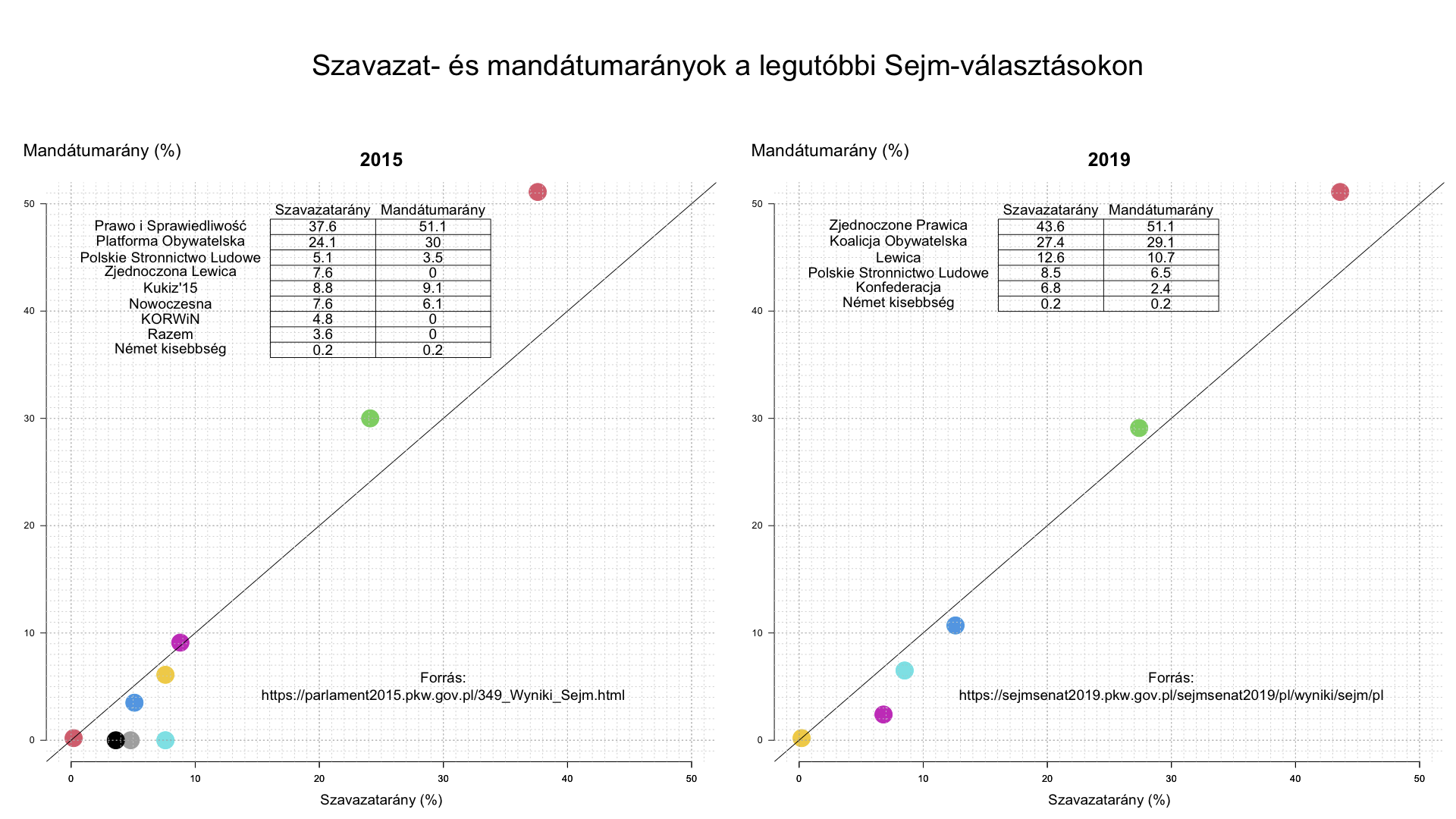 A valódi politikai pártok szavazótáborainak földrajzi elhelyezkedése azonban nem látható előre úgy, mint a német kisebbség tagjaié, és ezért hatékonyan alkalmazkodni se könnyű hozzá. Az általános helyzet ezért az, hogy a mandátumok nem egészen szavazatarányosan oszlanak meg a pártok között, de a torzulás mértéke megjósolhatatlanul változik pártról pártra és választásról választásra. Nem látható előre, hogy egy kis párt annyira szerencsés lesz-e, mint a Kukiz’15, vagy annyira peches, mint a Konfederacja-é 2019-ben. Utóbbinak 6,8% szavazattal csak 2,5% mandátum jutott 2019-ben, ezért szomorkodik az ötödik párt lila pöttye olyan messze az átlótól a fenti ábra jobboldali felén.