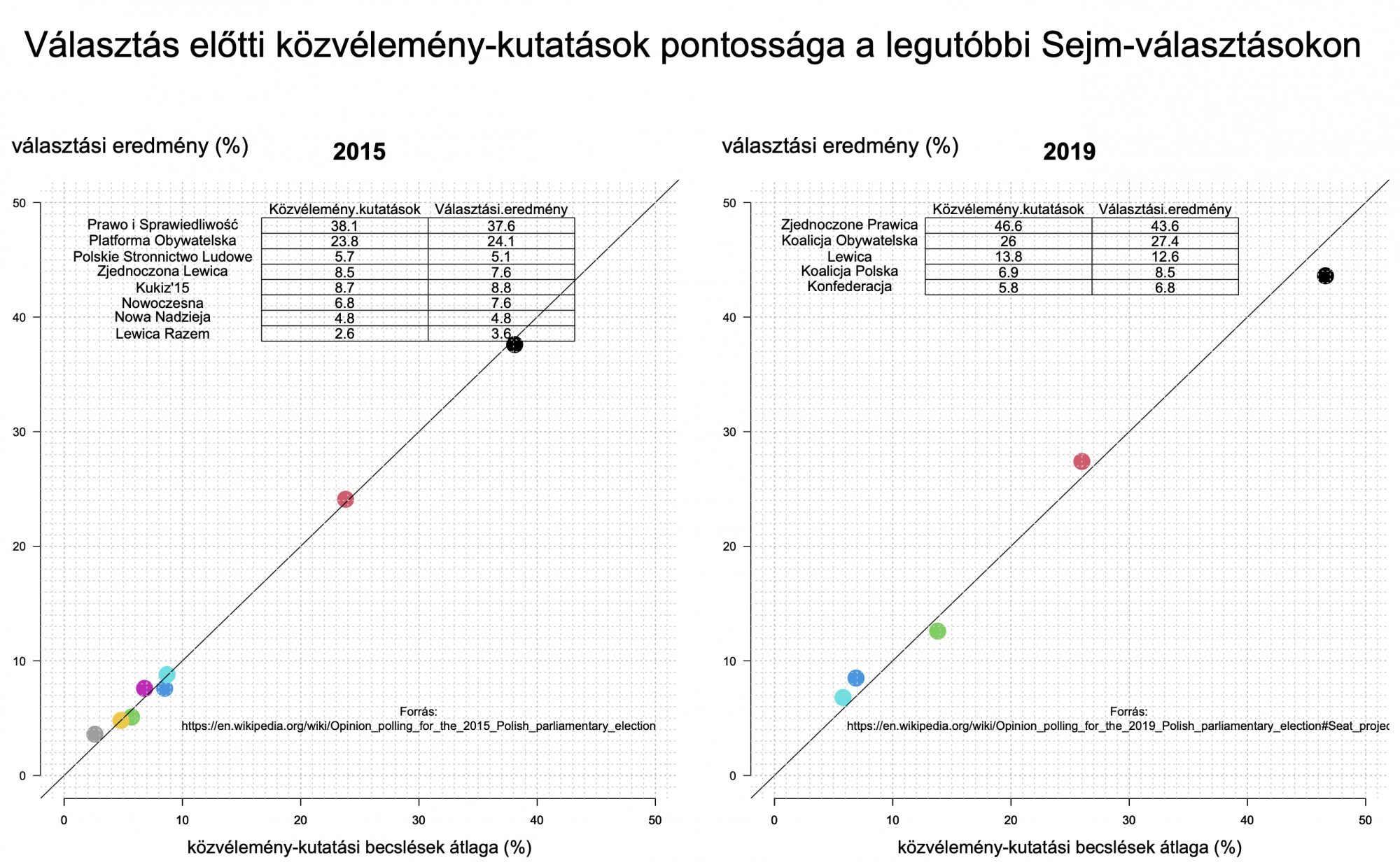 2019-ben ismét meglehetősen helyes válaszokat adott az előzetes kutatások átlaga. Bár a kormánypárt előnyét a fő ellenzéki párt előtt valamelyest túlbecsülte, de végül a valóságban is mandátumtöbbséget eredményezett a PiS és kisebb szövetségesei győzelme.