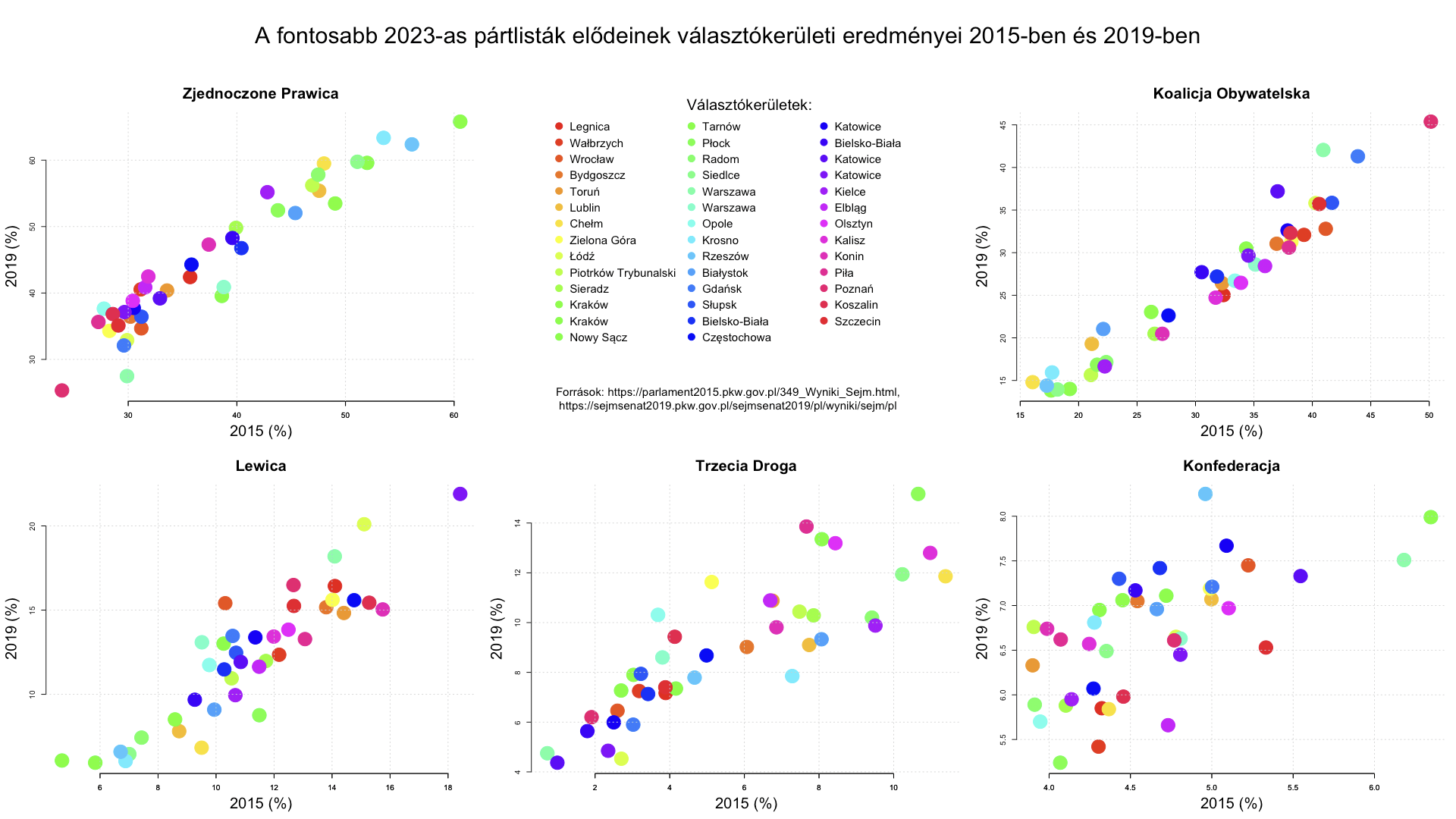 Mivel a mandátumokat 41 választókerületben osztják el, ezek eredményeit is meg kell saccolnunk a mandátumbecsléshez. Ebben nagy segítségünkre van az, hogy egy régi és sokszor bevált módszere a választási elemzéseknek a lengyel esetre különösen jól alkalmazhatónak tűnik. Egyrészt már 2015-ben és 2019-ben is nagyjából ugyanaz az öt fő politikai alternatíva közül választott a lengyelek túlnyomó többsége, mint a mai napon is. Csak annyi volt a különbség, hogy 2015-ben még nem egy, hanem két-két baloldali és liberális-konzervatív lista kapott jelentősebb választói támogatást. Ezeket a párokat együtt tekinthetjük a 2019-es (és 2023-as) Lewica illetve Koalicja Obywatelska elődjének. Másrészt, mint alábbi ábrám mutatja, rendkívül szoros, és szinte lineáris az összefüggés aközött, hogy az öt fő pártcsoport között melyiknek hol ment jobban, és hol kevésbé.