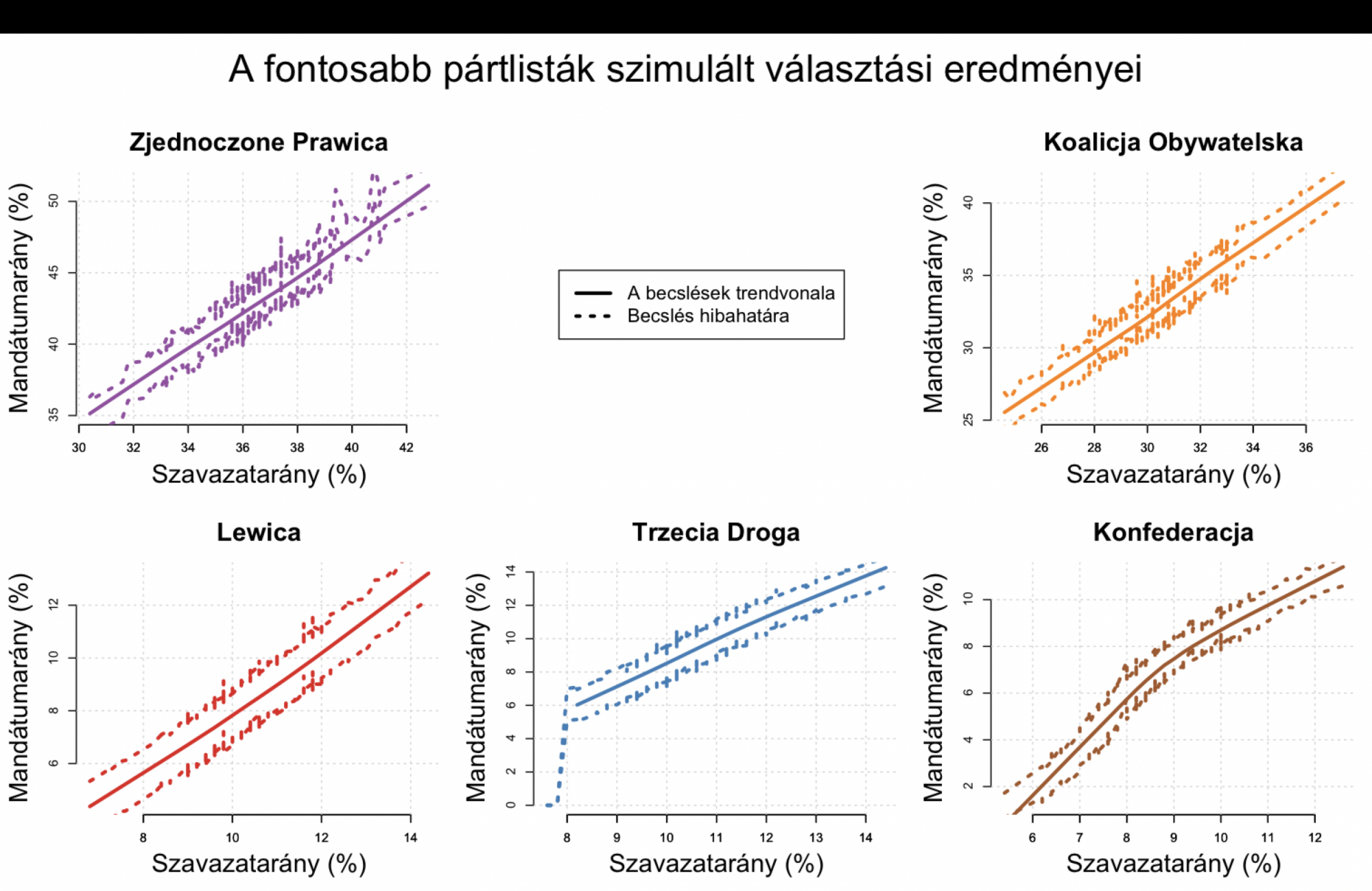 Az így kapott 160 ezer országos mandátummegoszlás összefüggését a hozzájuk kapcsolódó országos szavazatmegoszlással az alábbi ábra mutatja be. Az ábra paneljei az egyes pártokra mutatják meg, hogy különböző szavazatarányok mellett milyen mandátumarányra számíthatnak. Mivel egy-egy országos szavazatarány a többi pártok eredményeinek és a szavazatok földrajzi megoszlásának megfelelően más-más mandátumarányt hozhat, ezért a 160 ezer becslési eredmény helyett csak azok trendvonalát, illetve az egyes országos szavazatarányokhoz tartozó becslések átlagának hibahatárát mutatom be.